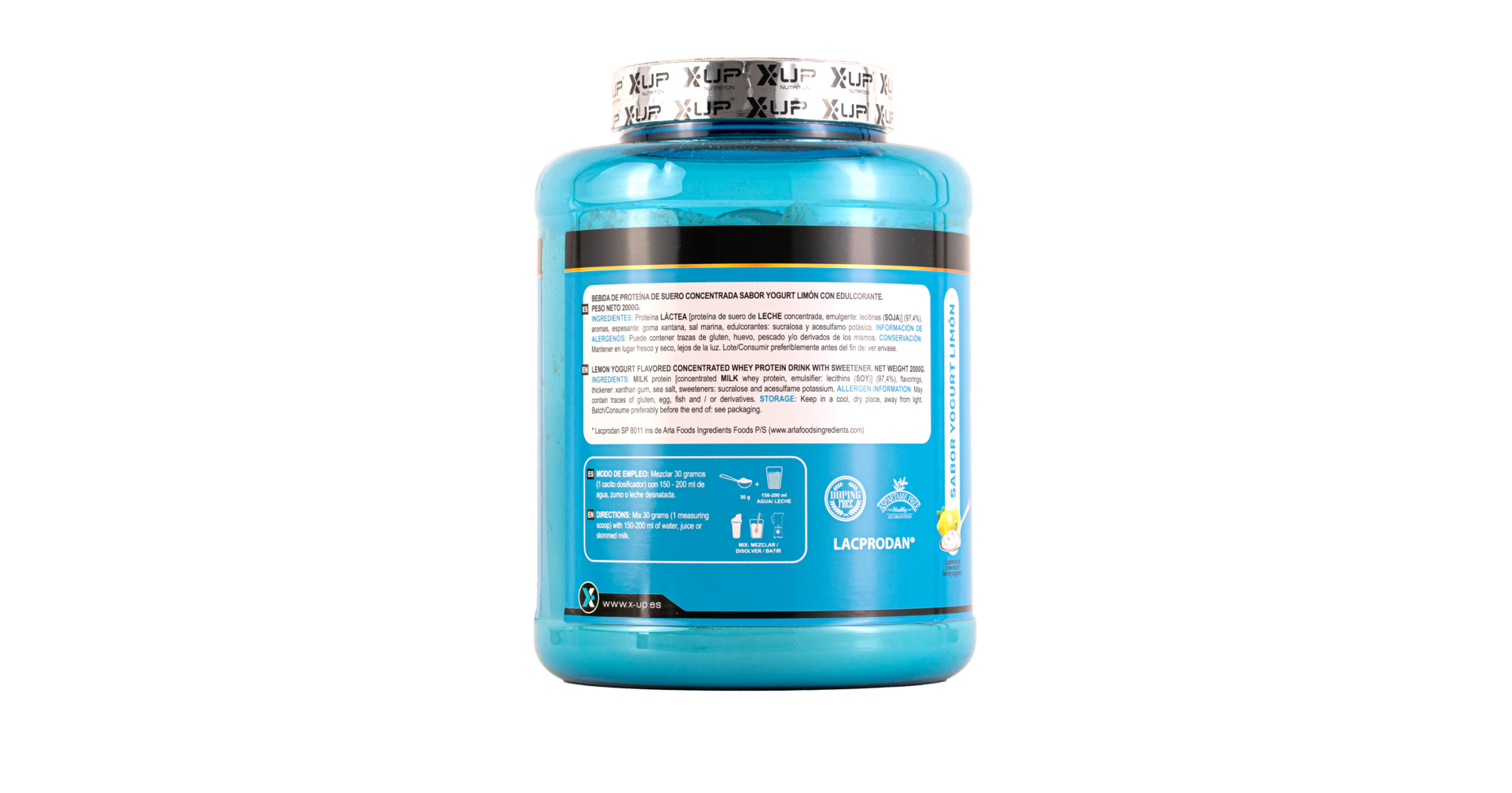 - Yogur limón: Proteína LÁCTEA [proteína de suero de LECHE concentrada, emulgente: lecitina de SOJA] (97,4%), aromas,espesante: goma xantana, sal marina, edulcorantes: sucralosa y acesulfamo potásico