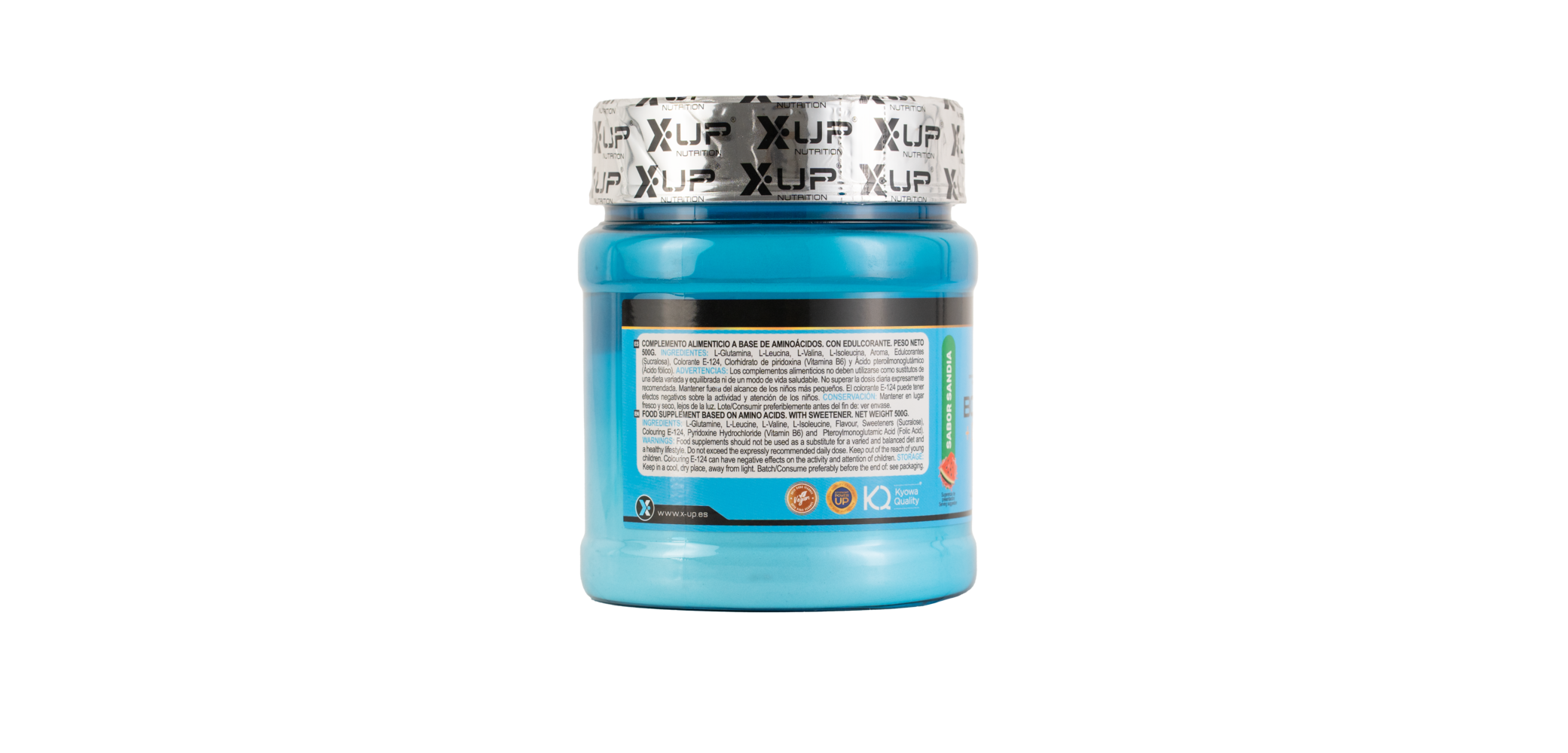 L-Glutamina, L-Leucina, L-Valina, L-Isoleucina, aroma, edulcorante (Sucralosa), colorante E-124, Clorhidrato de piridoxina (vitamina B6) y Ácido pteroilmonoglutámico (Ácido fólico).