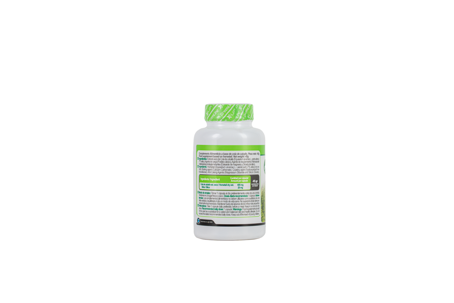 INGREDIENTES: Ext. seco de Cola de caballo (Equisetumarvense L-parte aérea-) (7% silica), Agente de carga (Fosfato cálcico), Agente de recubrimiento (Hidroxipropilmetilcelulosa), Antiaglomerantes (Estearato de magnesio y Dióxido de silicio).