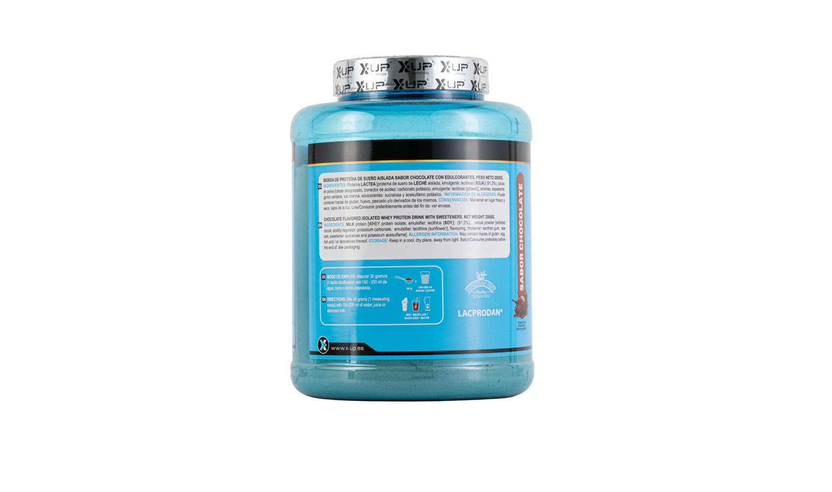 Proteína de suero de LECHE aislada [proteína de suero de LECHE aislada, emulgente: lecitina de SOJA] (91.2%), cacao en polvo [cacao desgrasado, corrector de acidez: carbonato potásico, emulgente: lecitinas (girasol)], aromas, espesante: goma xantana, sal marina, edulcorantes: sucralosa y acesulfamo potásico.