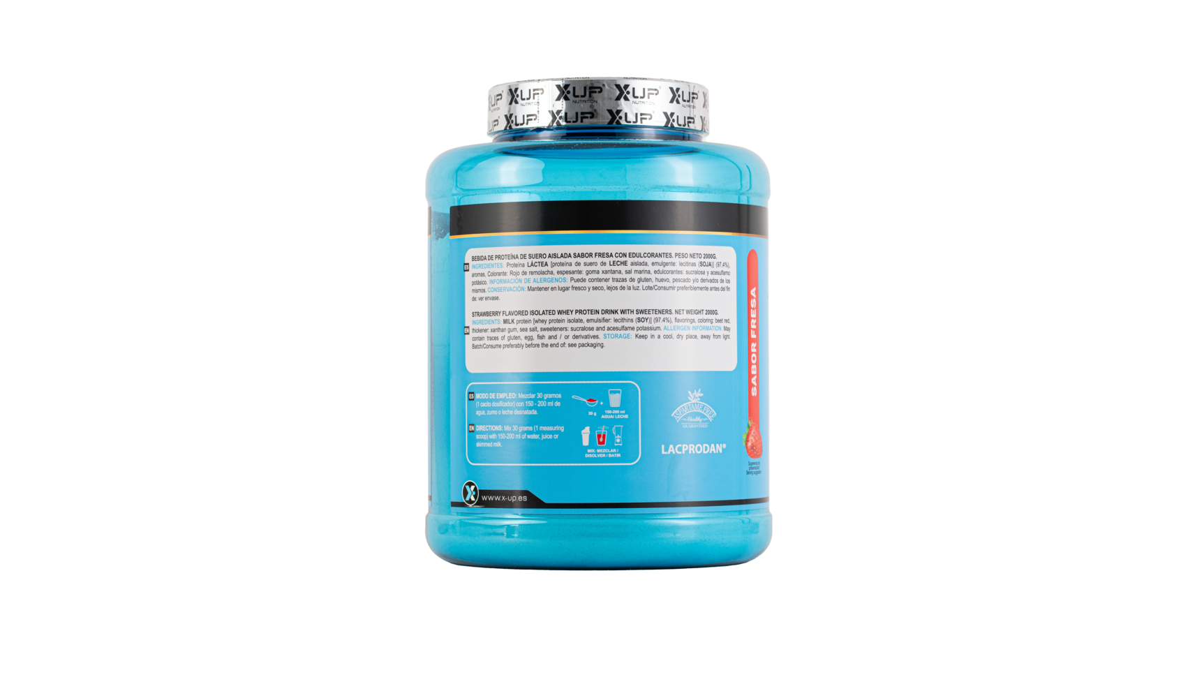 Proteína de suero de LECHE aislada [proteína de suero de LECHE aislada, emulgente: lecitina de SOJA] (97,4%), aromas, espesante: goma xantana,sal marina, edulcorantes: sucralosa y acesulfamo potásico.