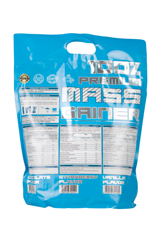 VAINILLA: Harina de AVENA (contiene GLUTEN), Dextrosa monohidrato, Concentrado de proteína de LECHE, Creatina monohidrato, Aroma vainilla, Edulcorante (Sucralosa).