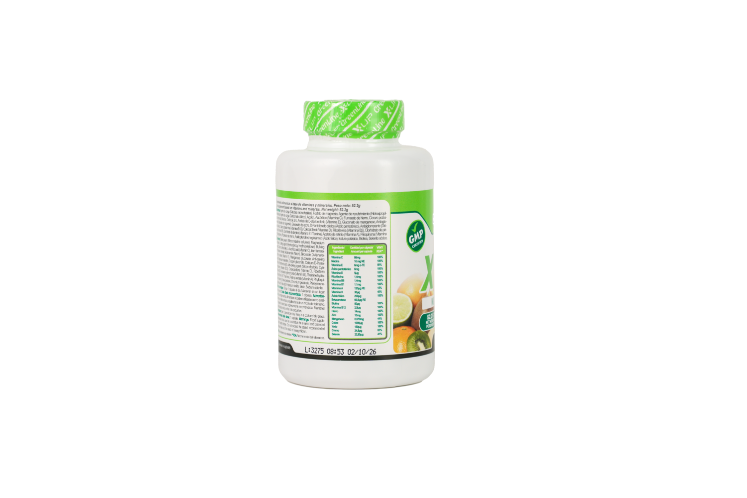 INGREDIENTES: Agente de carga (Celulosa microcristalina y carbonato cálcico), cápsula [agente de recubrimiento: hidroxipropilmetilcelulosa], sales magnésicas del ácido ortofosfórico, ácido L-áscórbico (vitamina C), fumarato ferroso, cloruro potásico, nicotinamida (niacina), antiaglomerantes: sales magnésicas de ácidos grasos y dióxido de silicio, óxido de zinc,acetato DL-alfa tocoferol (vitamina E), guconato de manganeso, gluconato de cobre, Dpantotenato cálcico (ácido D-pantoténico), colecalciferol (vitamina D), clorihidrato de piridoxina (vitamina B6), riboflavina (vitamina B2), clohidrato de tiamina (vitamina B1), vitamina A acetato, fitomenadiona (vitamina K), betacaroteno, ácido ateroilmonoglutámico (ácido fólico), yoduro potásico, picolinato de croom, D-biotina (biotina), selenio sódico, canocobalamina (vitamina B12).